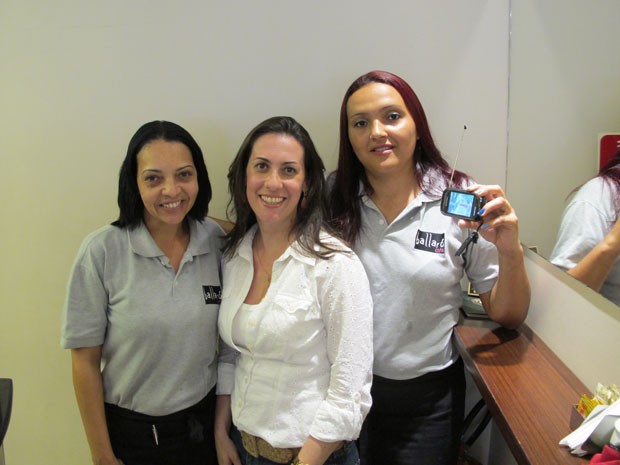 Em um café na região da avenida Paulista, Liliane de Souza Dias segura o celular do filho, que vai usar para ver o final de 'Avenida Brasil'; à esquerda, Tania Regina dos Santos, e, ao centro, Fabiana Anitabliam (Foto: Cauê Muraro/G1)