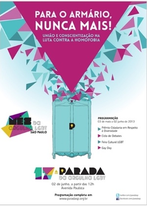A Associação da Parada do Orgulho GLBT de São Paulo (APOGLBT) divulgou nesta quinta-feira (2) o cartaz da Parada Gay deste ano, agendada para o dia 2 de junho. O tema da parada será "Para o armário nunca mais! União e Conscientização na luta contra a homofobia". Um dos carros alegóricos deve protestar contra pessoas que tentaram diminuir os direitos conquistados pelos homossexuais ao longo do ano, como o deputado federal Marco Feliciano (PSC-SP) MAIS Divulgação/APOGLBT