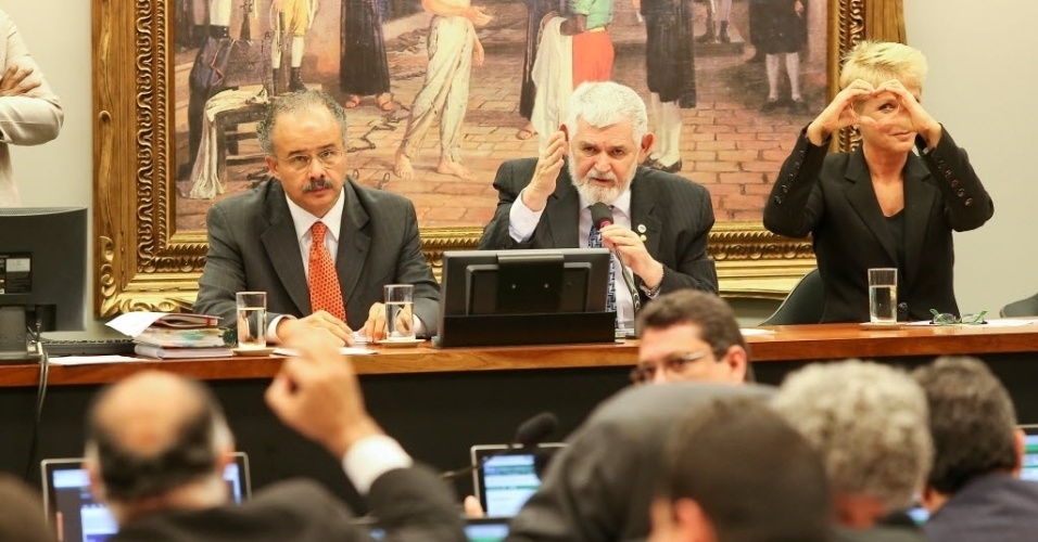 A apresentadora de TV Xuxa Meneghel respondeu com um gesto de coração feito com as mãos à crítica de deputado durante sessão da CCJ (Comissão de Constituição e Justiça e Cidadania) da Câmara que vota um projeto de lei que protege crianças e adolescentes de castigos físicos, conhecido como "Lei da Palmada", nesta quarta-feira (21). Xuxa é uma das defensoras da lei. Durante a sessão, o deputado Pastor Eurico (PSB-PE) (de costas na foto) afirmou que Xuxa não poderia defender as crianças por ter feito um filme em que aparece em uma cena de sexo com um garoto de cerca de 10 anos