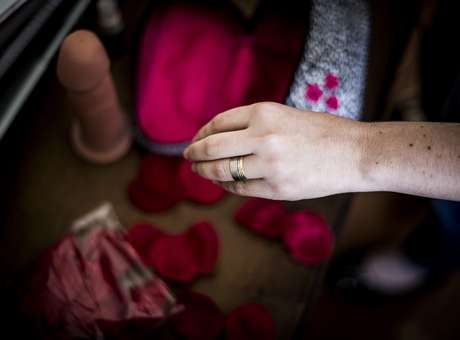 Ela carrega uma bolsinha com pétalas artificiais de rosas, preservativos, algemas, máscara e um pênis de borracha